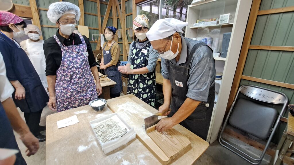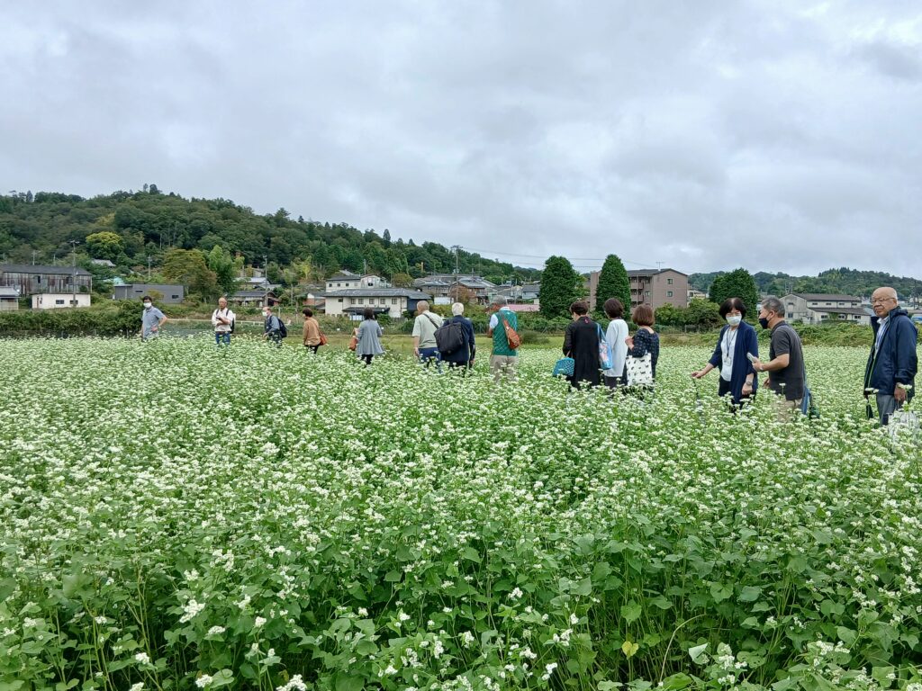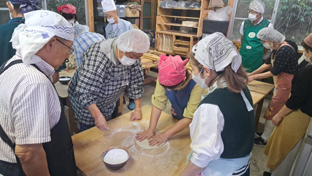 令和7年10月16日 甲南町民生員児童委員協議会そば道場 2025年10月29日NPO法人ふれ愛パーク この日甲南町の民生委員児童委員協議会の研修で46名(事務局含む)の委員さんがそば打ち研修をされました。そば打ちと試食、ふれ愛パークの趣旨や目標の説明とそば畑見学の2グループに分かれ、初めてのそば打ちやそばの花を楽しまれました。 またそば粉やそばの実、そば茶などもたくさんお買上げいただきました。ありがとうございました。